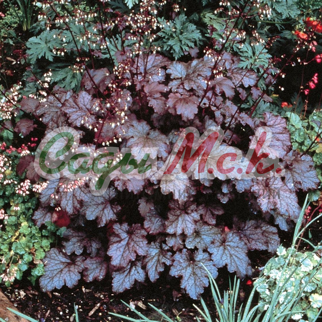 Гейхера BINOCHE - растение высотой 30 см и диаметром 40 см. Листья крупные, округло-зубчатые, волнистые,темно-коричнево-фиолетовые, матовые. Старые листья с темно-зеленым оттенком. Изнанка пурпурная, блестящая. Цветоносы развалистые, пурпурно-черные, соцветие разреженное, невзрачное, цветки кремовые. Нарастает быстро. Сорт устойчив к болезням.