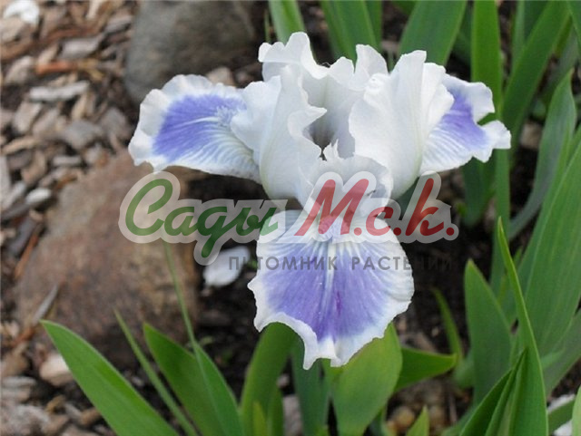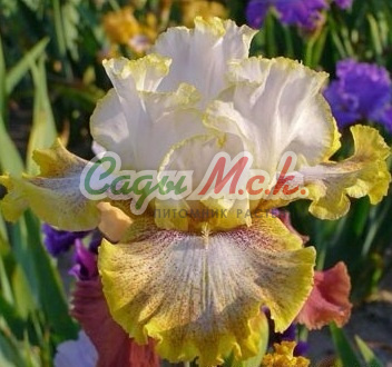 Ирис Harpswell Happiness обладает белыми стандартами, куполообразными с золотистой каймой по краям. Фолы- белые с сине – фиолетовыми прожилками, радиально отходящих от золотистых плеч по обе стороны оранжево – мандариновой бородкой и кремово – бежевой каймой, гофрированный.