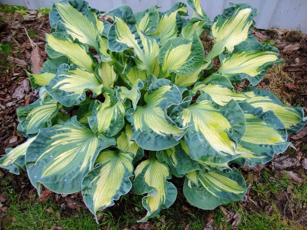Хоста Golden Meadows - высота 50-60 см. Листья округлые, морщинистые, "крученые". Центр весной ярко-золотистый, в середине лета кремовый, затем зеленеет до цвета шартрез, с очень широкой неравномерной тёмно голубовато-зелёной каймой, с язычками к центру листа. Цветки белые. Полутень.